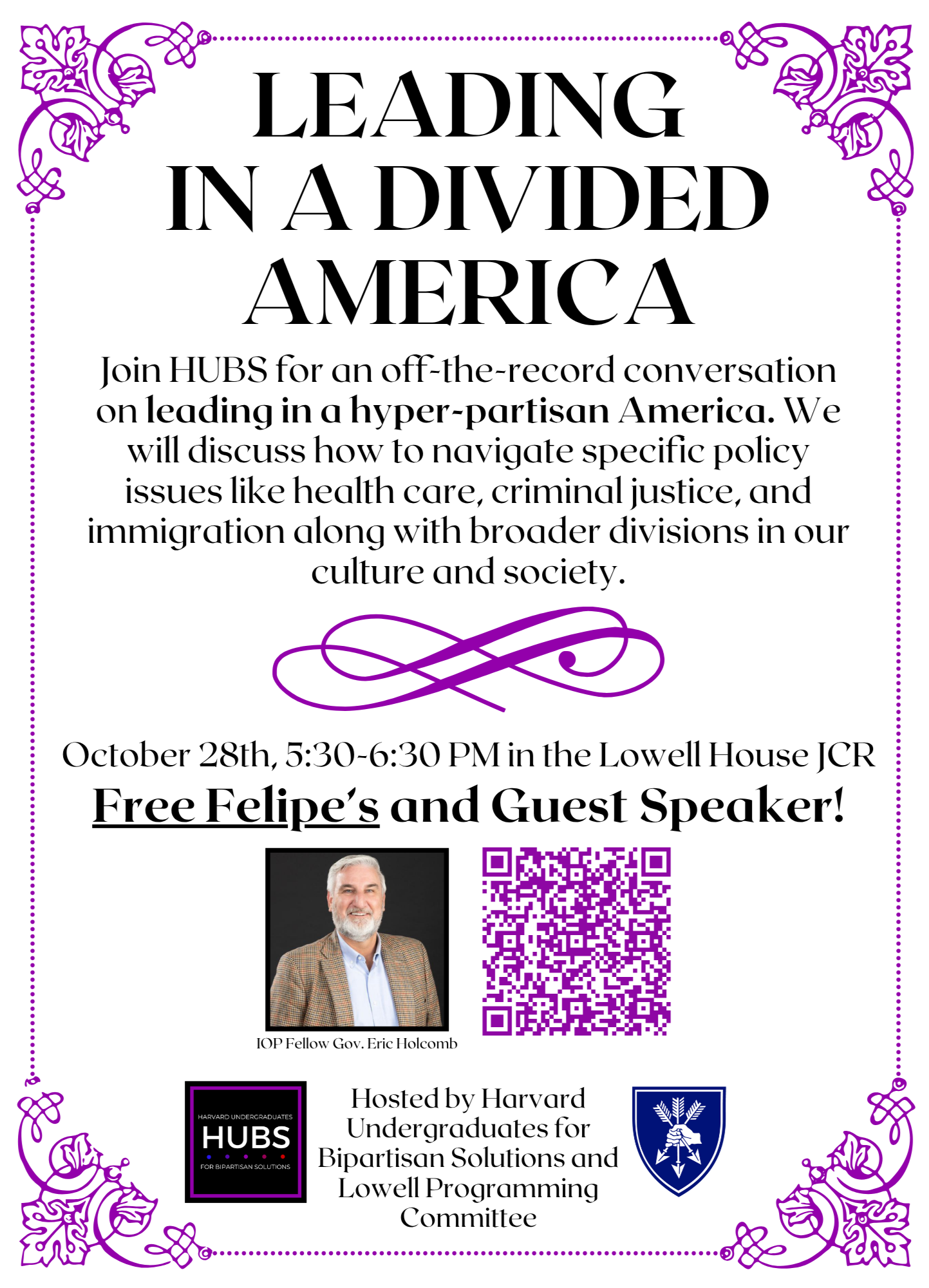 On November 14th, 2025 HUBS hosted a discourse dinner that tackled one of the most important questions facing our generation: what does effective leadership mean and look like in an increasingly divided and polarized country? Former Governor of Indiana, Eric Holcomb, joined HUBS to explain how he navigated specific policy issues like healthcare, criminal justice, and immigration and, often, worked across political lines to pass the most effective legislation for his constituents during his time in office from 2017 to 2025. The panel was followed by a lively dinner with Gov. Holcomb where students were able to bring their own perspectives and personal experiences into the discussion of leadership.